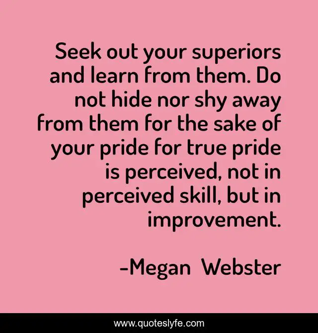 This page presents the quote "Seek out your superiors and learn from them. Do not hide nor shy away from them for the sake of your pride for true pride is perceived, not in perceived skill, but in improvement.". Author of this quote is Megan Webster. This quote is about superiors, wisdom, pride, inspirational, enthusiasm,.