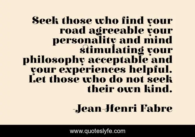 This page presents the quote "Seek those who find your road agreeable your personality and mind stimulating your philosophy acceptable and your experiences helpful. Let those who do not seek their own kind.". Author of this quote is Jean-Henri Fabre. .