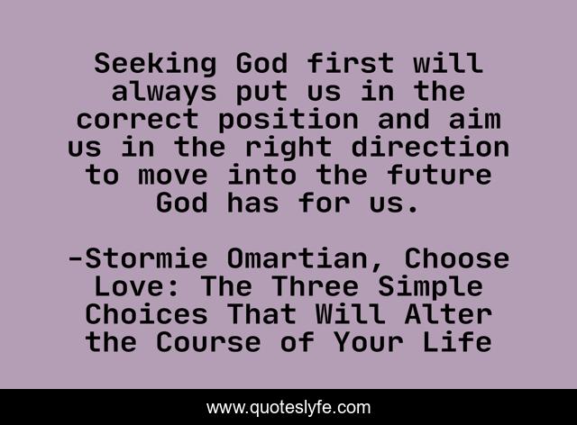This page presents the quote "Seeking God first will always put us in the correct position and aim us in the right direction to move into the future God has for us.". Author of this quote is Stormie Omartian, Choose Love: The Three Simple Choices That Will Alter the Course of Your Life. This quote is about uplifting, god, christian-living, inspirational, future-inspirational, enthusiasm,.