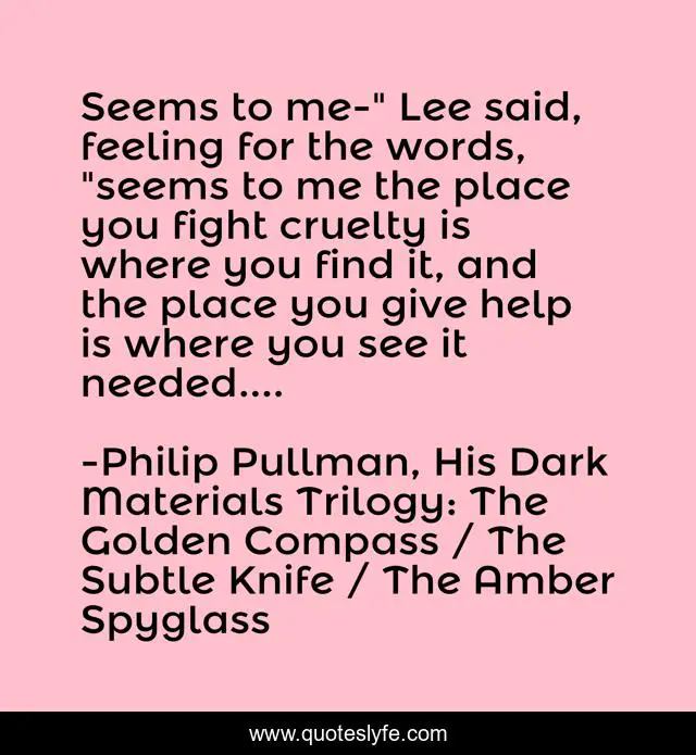 This page presents the quote "Seems to me-" Lee said, feeling for the words, "seems to me the place you fight cruelty is where you find it, and the place you give help is where you see it needed....". Author of this quote is Philip Pullman, His Dark Materials Trilogy: The Golden Compass / The Subtle Knife / The Amber Spyglass. .
