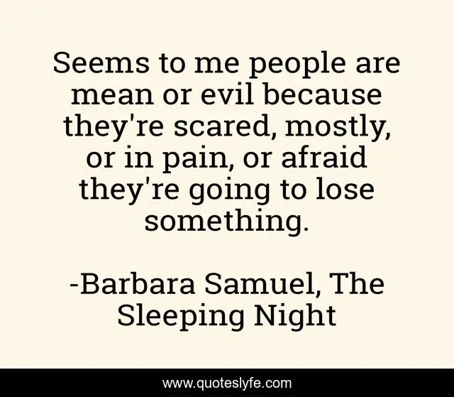 This page presents the quote "Seems to me people are mean or evil because they're scared, mostly, or in pain, or afraid they're going to lose something.". Author of this quote is Barbara Samuel, The Sleeping Night. This quote is about scared, pain, evil, mean,.