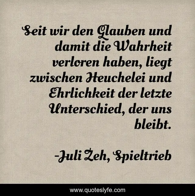 This page presents the quote "Seit wir den Glauben und damit die Wahrheit verloren haben, liegt zwischen Heuchelei und Ehrlichkeit der letzte Unterschied, der uns bleibt.". Author of this quote is Juli Zeh, Spieltrieb. This quote is about justice, faith, honesty, truth, religion,.