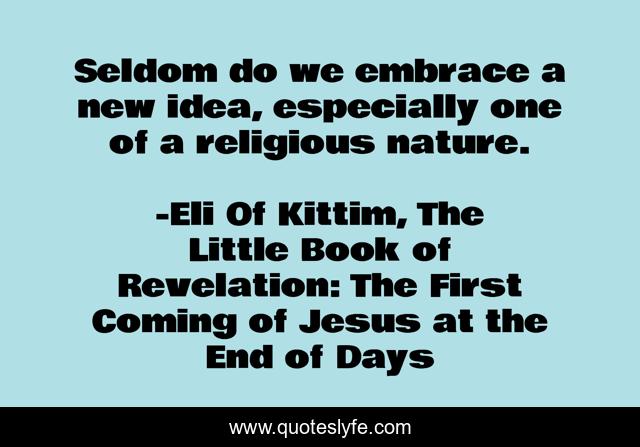 This page presents the quote "Seldom do we embrace a new idea, especially one of a religious nature.". Author of this quote is Eli Of Kittim, The Little Book of Revelation: The First Coming of Jesus at the End of Days. This quote is about meanings, religion, acceptance, new-interpretations, spirituality, intellectual-ideas, new-ideas, inspirational, innovation,.