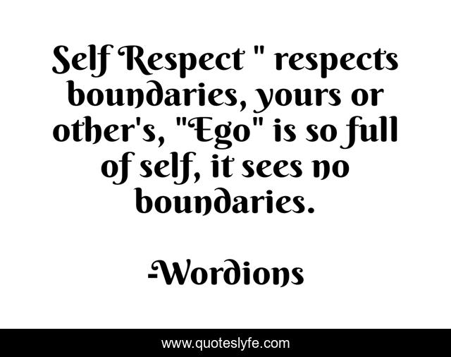 This page presents the quote "Self Respect " respects boundaries, yours or other's, "Ego" is so full of self, it sees no boundaries.". Author of this quote is Wordions. This quote is about boundaries, wordions-com, self-respect, ego, wordions,.