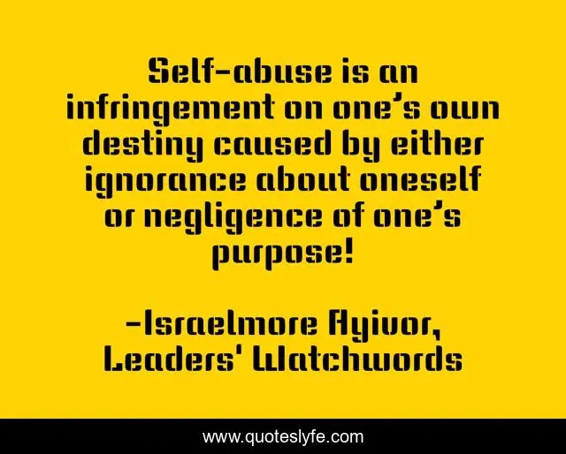 This page presents the quote "Self-abuse is an infringement on one’s own destiny caused by either ignorance about oneself or negligence of one’s purpose!". Author of this quote is Israelmore Ayivor, Leaders' Watchwords. This quote is about food-for-thought, destiny, infringement, purposeful, potentials, negligence, ignorance, gifts, talents,.
