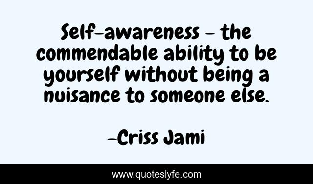 This page presents the quote "Self-awareness - the commendable ability to be yourself without being a nuisance to someone else.". Author of this quote is Criss Jami. This quote is about hypocrisy, empathy, self-awareness, self-control, understanding,.
