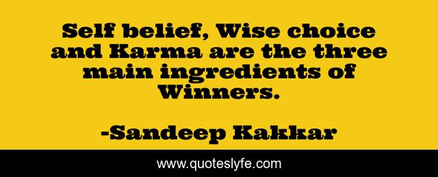 This page presents the quote "Self belief, Wise choice and Karma are the three main ingredients of Winners.". Author of this quote is Sandeep Kakkar. This quote is about confidence, positive, motivational, winning, winners, optimistic, inspirational, enthusiasm,.