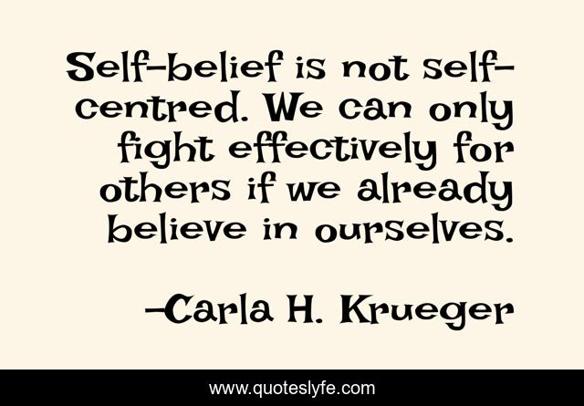 This page presents the quote "Self-belief is not self-centred. We can only fight effectively for others if we already believe in ourselves.". Author of this quote is Carla H. Krueger. This quote is about caring-for-others, self-belief, fighting-spirit, inspirational, enthusiasm,.