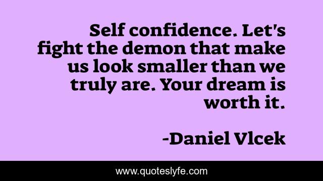 This page presents the quote "Self confidence. Let's fight the demon that make us look smaller than we truly are. Your dream is worth it.". Author of this quote is Daniel Vlcek. This quote is about confidence, self-confidence, self-esteem,.