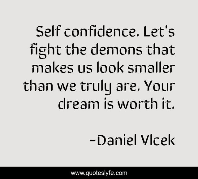 This page presents the quote "Self confidence. Let's fight the demons that makes us look smaller than we truly are. Your dream is worth it.". Author of this quote is Daniel Vlcek. This quote is about confidence, self-confidence, self-esteem,.