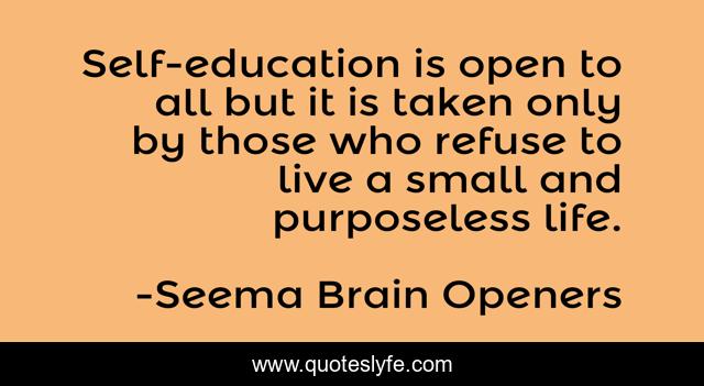 This page presents the quote "Self-education is open to all but it is taken only by those who refuse to live a small and purposeless life.". Author of this quote is Seema Brain Openers. This quote is about motivation, leaders, success, self-education, mission, purpose, vision, victors,.