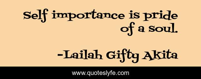 This page presents the quote "Self importance is pride of a soul.". Author of this quote is Lailah Gifty Akita. This quote is about wise-sayings, self-importance, humble-yourself, inspirational, enthusiasm, pride,.