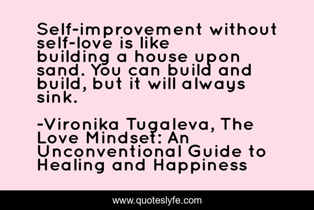 This page presents the quote "Self-improvement without self-love is like building a house upon sand. You can build and build, but it will always sink.". Author of this quote is Vironika Tugaleva, The Love Mindset: An Unconventional Guide to Healing and Happiness. This quote is about self-acceptance, self-love, self-improvement, change, self-knowledge,.