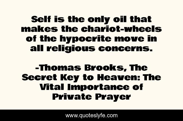 This page presents the quote "Self is the only oil that makes the chariot-wheels of the hypocrite move in all religious concerns.". Author of this quote is Thomas Brooks, The Secret Key to Heaven: The Vital Importance of Private Prayer. This quote is about puritan, christian,.
