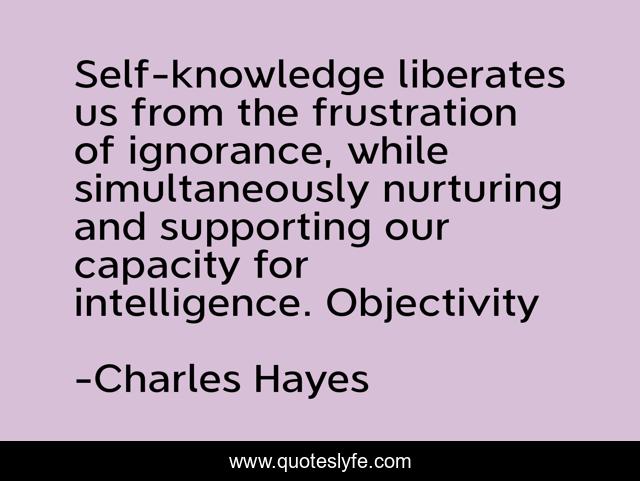This page presents the quote "Self-knowledge liberates us from the frustration of ignorance, while simultaneously nurturing and supporting our capacity for intelligence. Objectivity". Author of this quote is Charles Hayes. .