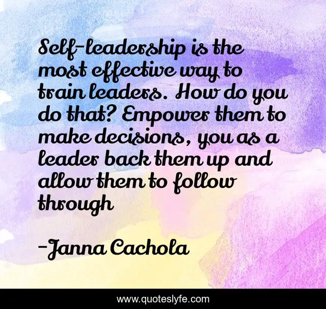 This page presents the quote "Self-leadership is the most effective way to train leaders. How do you do that? Empower them to make decisions, you as a leader back them up and allow them to follow through". Author of this quote is Janna Cachola. This quote is about empowerment, leadership, team-builder,.