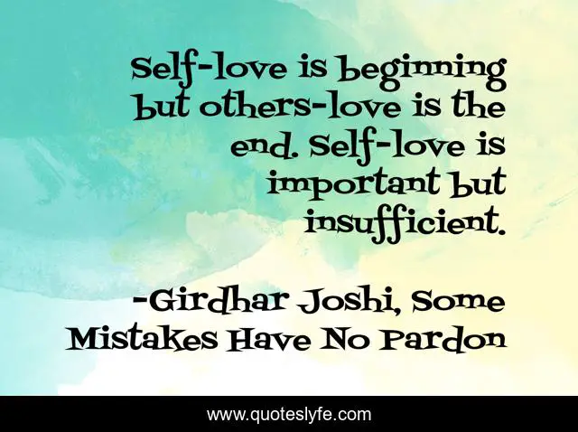 This page presents the quote "Self-love is beginning but others-love is the end. Self-love is important but insufficient.". Author of this quote is Girdhar Joshi, Some Mistakes Have No Pardon. This quote is about other-love, self-love,.