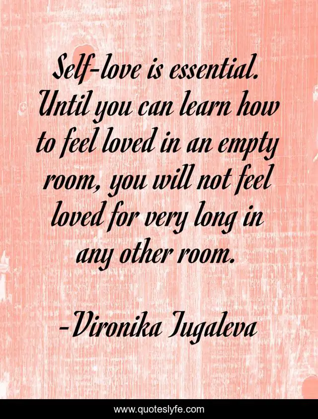 This page presents the quote "Self-love is essential. Until you can learn how to feel loved in an empty room, you will not feel loved for very long in any other room.". Author of this quote is Vironika Tugaleva. This quote is about relationships, self-love, self-confidence, love-yourself, self-acceptance, love, affection, self-esteem,.