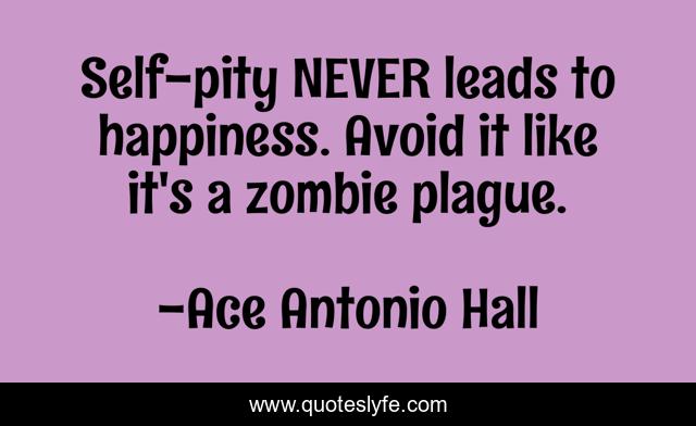 This page presents the quote "Self-pity NEVER leads to happiness. Avoid it like it's a zombie plague.". Author of this quote is Ace Antonio Hall. This quote is about pity, quotes, happiness, zombies,.