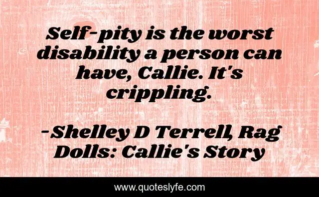 This page presents the quote "Self-pity is the worst disability a person can have, Callie. It's crippling.". Author of this quote is Shelley D Terrell, Rag Dolls: Callie's Story. This quote is about life-philosophy, thought-provoking, inspirational, enthusiasm,.