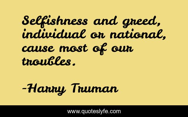This page presents the quote "Selfishness and greed, individual or national, cause most of our troubles.". Author of this quote is Harry Truman. This quote is about national-troubles, government, troubles, cause-of-trouble, problems, wisdom, selfishness, trouble, problems-in-the-world,.