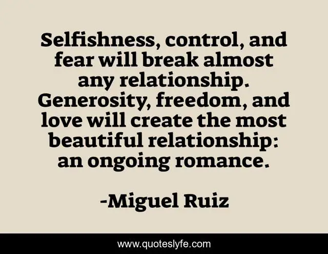 This page presents the quote "Selfishness, control, and fear will break almost any relationship. Generosity, freedom, and love will create the most beautiful relationship: an ongoing romance.". Author of this quote is Miguel Ruiz. This quote is about relationships, self-love, love, affection,.