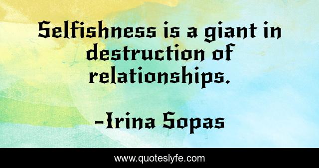 This page presents the quote "Selfishness is a giant in destruction of relationships.". Author of this quote is Irina Sopas. This quote is about relationships, irinasopas, love, selfishness, affection, destruction,.