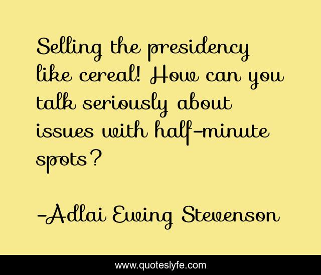 This page presents the quote "Selling the presidency like cereal! How can you talk seriously about issues with half-minute spots?". Author of this quote is Adlai Ewing Stevenson. This quote is about media, television, presidency, politics,.