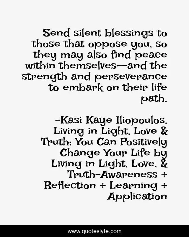 "Kasi Kaye Iliopoulos, Living in Light, Love & Truth: You Can Positively Change Your Life by Living in Light, Love, & Truth-Awareness + Reflection + Learning + Application Quotes." Quoteslyfe.com, 2025. Mon. 08 Dec. 2025. <https://www.quoteslyfe.com/quote/Send-silent-blessings-to-those-that-oppose-240890>.