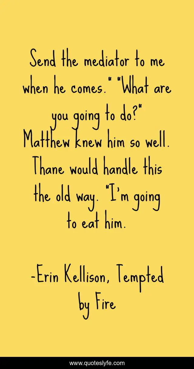 This page presents the quote "Send the mediator to me when he comes." "What are you going to do?" Matthew knew him so well. Thane would handle this the old way. "I'm going to eat him.". Author of this quote is Erin Kellison, Tempted by Fire. This quote is about mystery, shifters, dragons,.