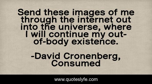 This page presents the quote "Send these images of me through the internet out into the universe, where I will continue my out-of-body existence.". Author of this quote is David Cronenberg, Consumed. This quote is about images, existence, internet, out-of-body, universe,.