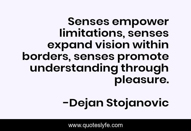 This page presents the quote "Senses empower limitations, senses expand vision within borders, senses promote understanding through pleasure.". Author of this quote is Dejan Stojanovic. This quote is about limitations, empowerment, literature, dejan-stojanovic, poetry, understanding, quotes, senses, thoughts,.