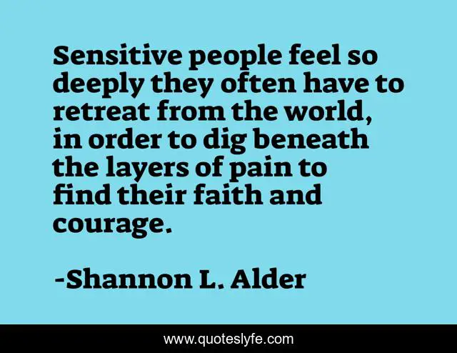 This page presents the quote "Sensitive people feel so deeply they often have to retreat from the world, in order to dig beneath the layers of pain to find their faith and courage.". Author of this quote is Shannon L. Alder. This quote is about christian-missions, needs, pain, healing, distance, sensitive-people, breaks, renewal, heal,.