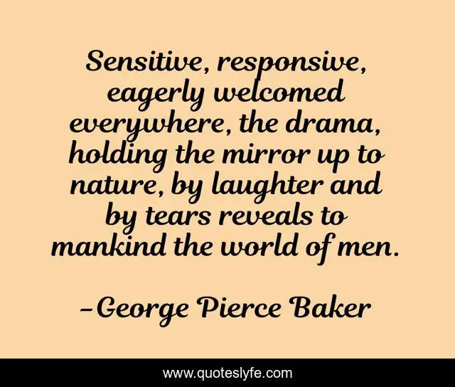 This page presents the quote "Sensitive, responsive, eagerly welcomed everywhere, the drama, holding the mirror up to nature, by laughter and by tears reveals to mankind the world of men.". Author of this quote is George Pierce Baker. This quote is about world, men, laughter,.