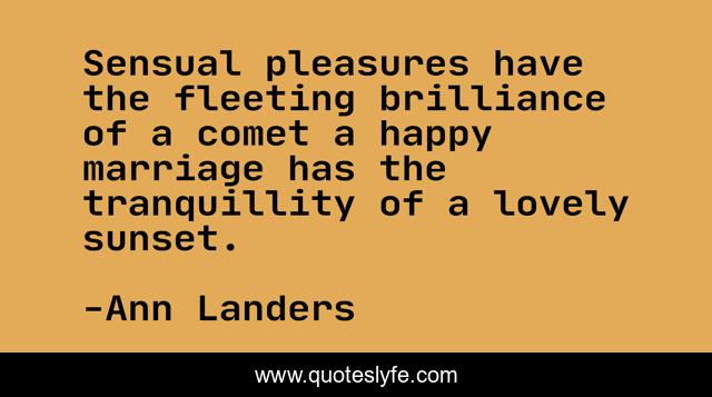 This page presents the quote "Sensual pleasures have the fleeting brilliance of a comet a happy marriage has the tranquillity of a lovely sunset.". Author of this quote is Ann Landers. This quote is about lovely, sunset, happy,.