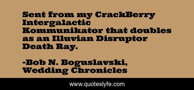 This page presents the quote "Sent from my CrackBerry Intergalactic Kommunikator that doubles as an Illuvian Disruptor Death Ray.". Author of this quote is Bob N. Boguslavski, Wedding Chronicles. .