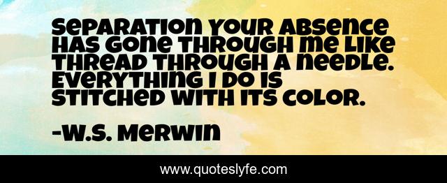 This page presents the quote "Separation Your absence has gone through me Like thread through a needle. Everything I do is stitched with its color.". Author of this quote is W.S. Merwin. This quote is about loss, loneliness, influence, poetry,.