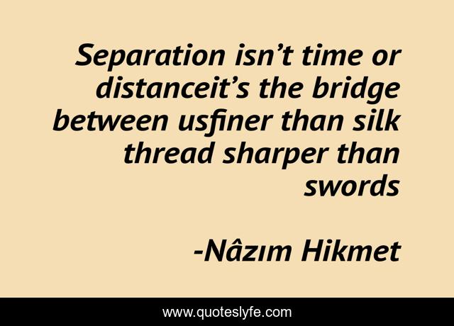 This page presents the quote "Separation isn’t time or distanceit’s the bridge between usfiner than silk thread sharper than swords". Author of this quote is Nâzım Hikmet. This quote is about seperation, romantic,.