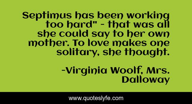 This page presents the quote "Septimus has been working too hard" - that was all she could say to her own mother. To love makes one solitary, she thought.". Author of this quote is Virginia Woolf, Mrs. Dalloway. This quote is about alone, philosophy, love, solitude, affection,.