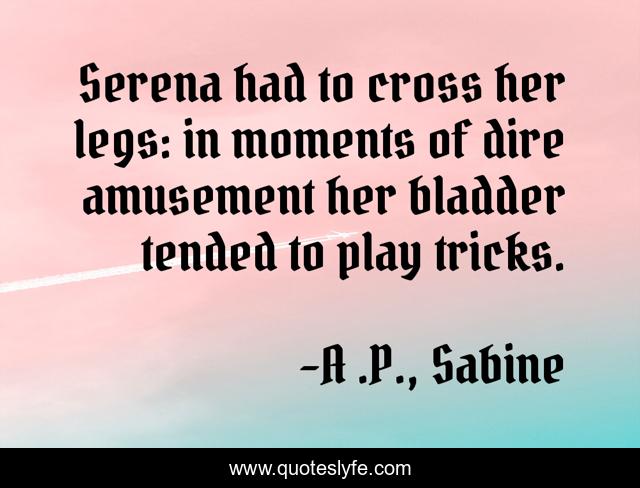 This page presents the quote "Serena had to cross her legs: in moments of dire amusement her bladder tended to play tricks.". Author of this quote is A .P., Sabine. This quote is about funny, comedy, humor, amusement, hilarious,.