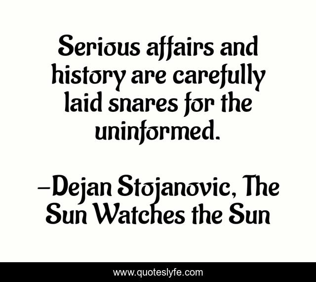 This page presents the quote "Serious affairs and history are carefully laid snares for the uninformed.". Author of this quote is Dejan Stojanovic, The Sun Watches the Sun. This quote is about affairs, poets, literature, uninformed, snares, dejan-stojanovic, philosophy, poetry, wisdom,.