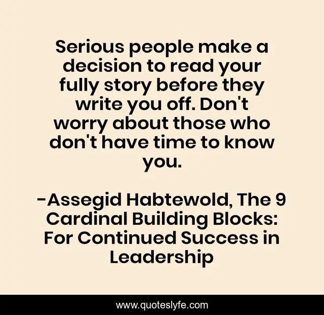 This page presents the quote "Serious people make a decision to read your fully story before they write you off. Don't worry about those who don't have time to know you.". Author of this quote is Assegid Habtewold, The 9 Cardinal Building Blocks: For Continued Success in Leadership. This quote is about story, don-t-worry, full-story, know-you, write-you-off, serious, success-pathways, assegid-habtewold,.