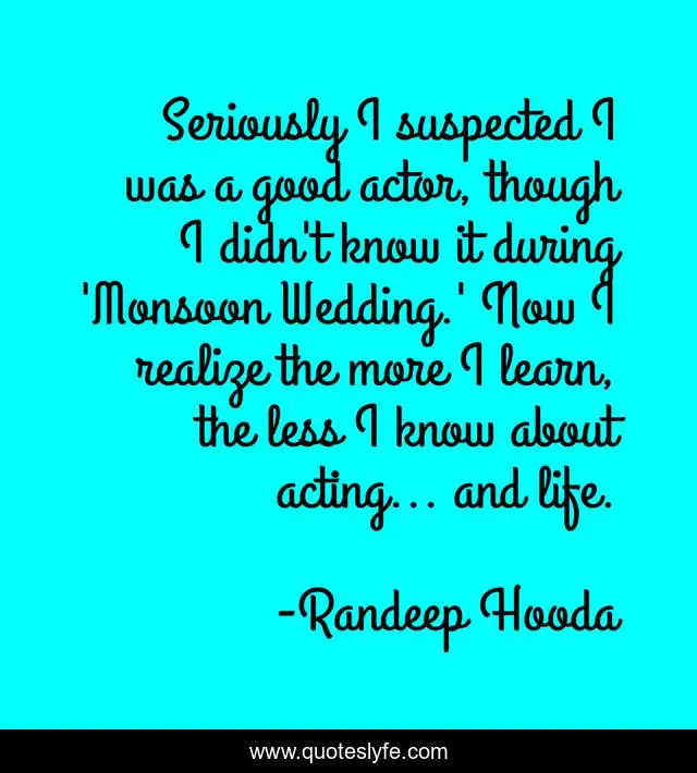 This page presents the quote "Seriously I suspected I was a good actor, though I didn't know it during 'Monsoon Wedding.' Now I realize the more I learn, the less I know about acting... and life.". Author of this quote is Randeep Hooda. This quote is about life, good, acting,.