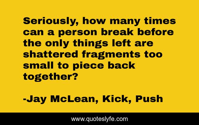 This page presents the quote "Seriously, how many times can a person break before the only things left are shattered fragments too small to piece back together?". Author of this quote is Jay McLean, Kick, Push. This quote is about broken, fragments, brokenness, shattered,.