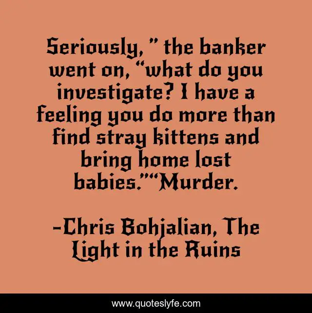 This page presents the quote "Seriously, ” the banker went on, “what do you investigate? I have a feeling you do more than find stray kittens and bring home lost babies.”“Murder.". Author of this quote is Chris Bohjalian, The Light in the Ruins. This quote is about lost-babies, stray-kittens, murder,.