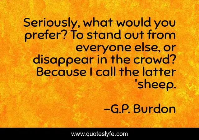This page presents the quote "Seriously, what would you prefer? To stand out from everyone else, or disappear in the crowd? Because I call the latter 'sheep.". Author of this quote is G.P. Burdon. This quote is about humorous, enthusiasm, humor, inspirational,.