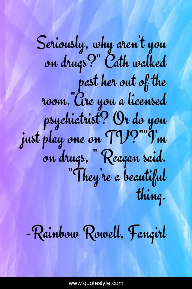 This page presents the quote "Seriously, why aren't you on drugs?" Cath walked past her out of the room."Are you a licensed psychiatrist? Or do you just play one on TV?""I'm on drugs, " Reagan said. "They're a beautiful thing.". Author of this quote is Rainbow Rowell, Fangirl. This quote is about drugs, humorous, depression,.