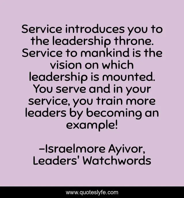 "Israelmore Ayivor, Leaders' Watchwords Quotes." Quoteslyfe.com, 2025. Tue. 09 Dec. 2025. <https://www.quoteslyfe.com/quote/Service-introduces-you-to-the-leadership-throne-129356>.
