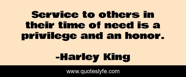 This page presents the quote "Service to others in their time of need is a privilege and an honor.". Author of this quote is Harley King. This quote is about need, privilege, honor, service,.
