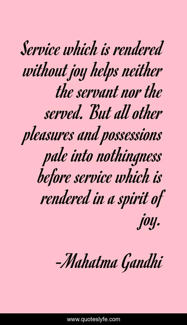 This page presents the quote "Service which is rendered without joy helps neither the servant nor the served. But all other pleasures and possessions pale into nothingness before service which is rendered in a spirit of joy.". Author of this quote is Mahatma Gandhi. This quote is about buddhism, service,.
